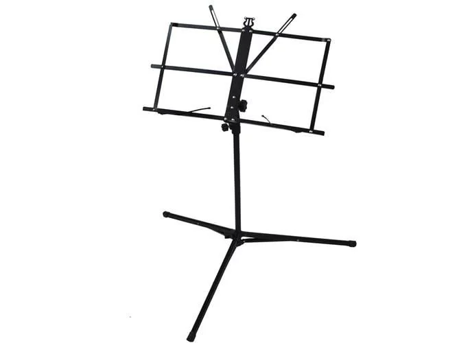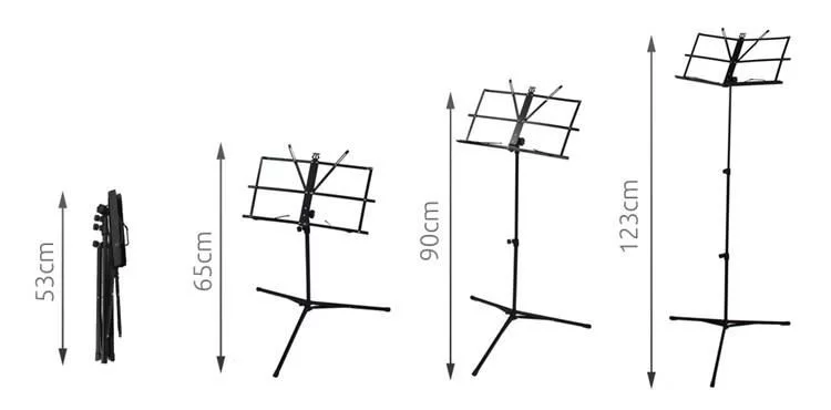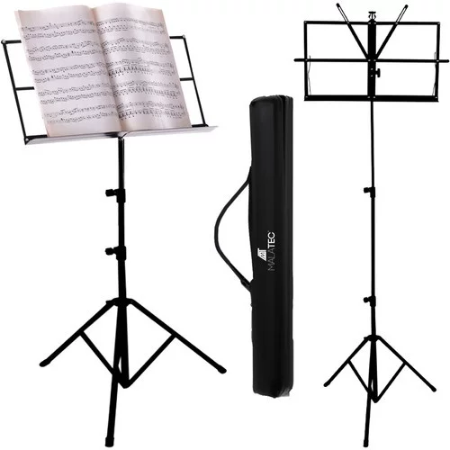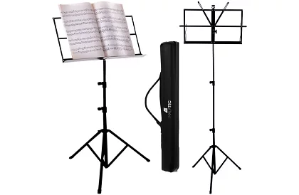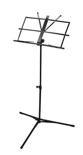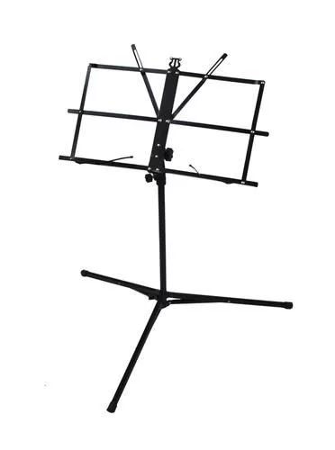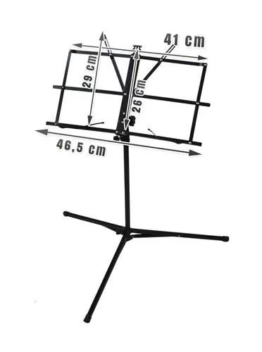 A zenei állvány stabil, összecsukható és praktikus kiegészítő professzionális és amatőr zenészek számára. A háromlábú alap biztosítja a szilárdságot és a biztonságot használat közben. Állítható magassággal rendelkezik három szinten, így használható állva, ülve vagy asztalra helyezve. A összecsukható munkafelület lehetőséget biztosít a szög beállítására, ami lehetővé teszi a kottakönyv tökéletes olvashatóságát. Az állítható megállítók megakadályozzák a kottakönyv becsukódását. Az állvány könnyen összecsukható, nem foglal sok helyet, és a csomag része egy praktikus borítás is a kényelmes szállításhoz.