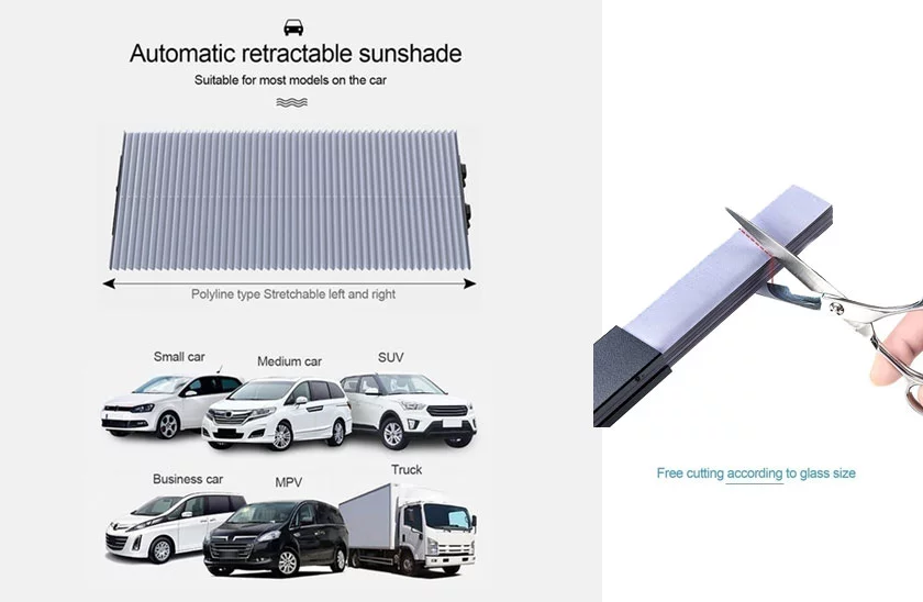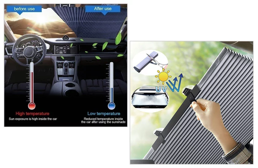 Nincs módjában parkolóhelyet találni az árnyékban, hogy megvédje autóját a hőtől? Az UV sugárzás elleni a napellenző az ideális megoldás! Ez az napellenző hihetetlenül többfunkciós és sokoldalú, nemcsak megvédi járművét a napsugaraktól, hanem sokféle járműhöz is alkalmas: kisteherautók, teherautók, szedánkocsik és SUV-k! Egyszerűen tessék levágni a szélvédőd a kívánt méretre, és már kész is! Ez a leggyorsabb autós a piacon! Nyújtsa ki a napellenzőt jobbról balra egy mozdulattal, és akassza fel.