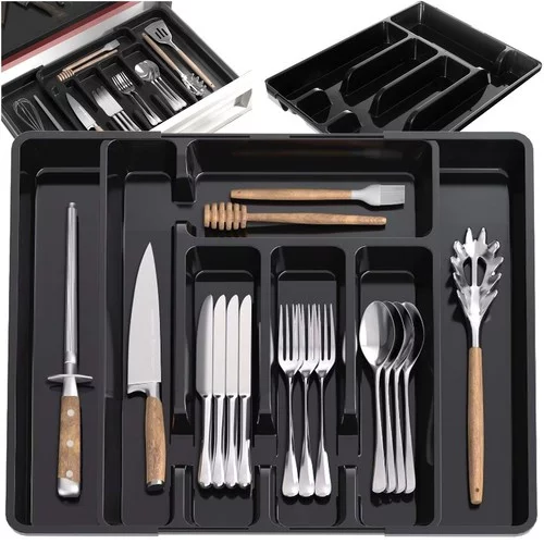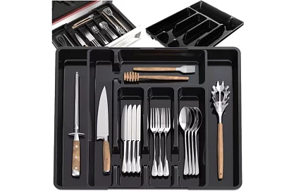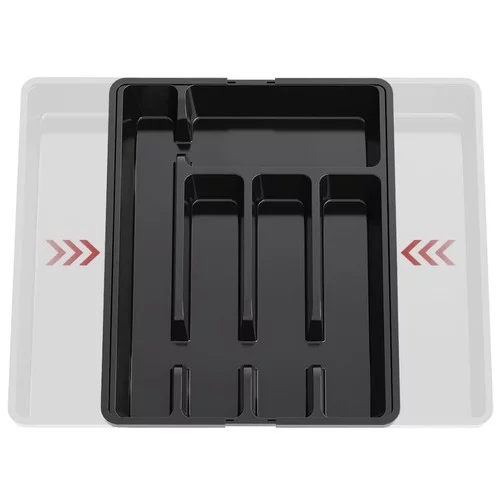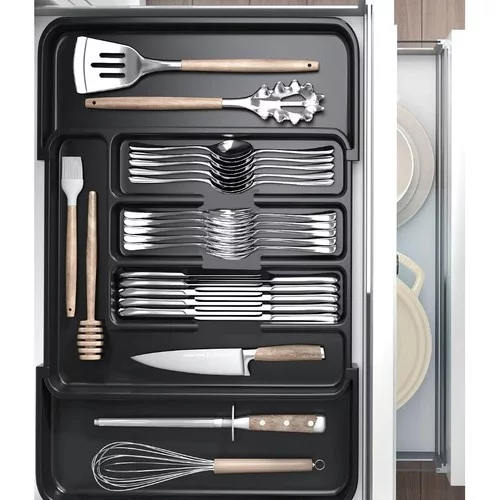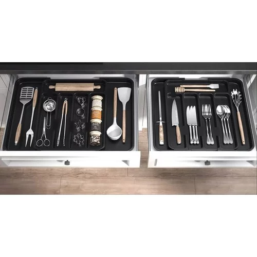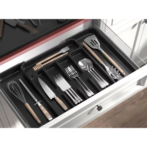 A szervező maximális áttekintést és rendet biztosít a fiókokban, időt takarít meg az evőeszközök és konyhai eszközök keresésekor. A állítható kihúzható mechanizmusnak köszönhetően alkalmazkodik a különböző fiók szélességekhez, és elfér benne minden evőeszköz és kiegészítő. Az elegáns fekete dizájn kiegészíti a modern konyha megjelenését, és a tartós anyag hosszú élettartamot garantál.