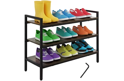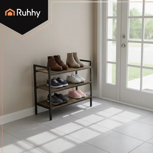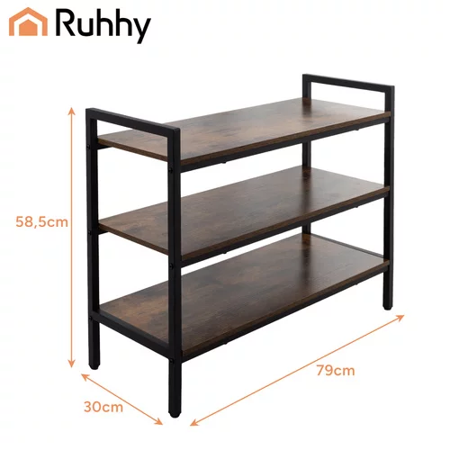 Stílusos Ruhhy cipőtartó ötvözi a funkcionalitást, tartósságot és loft stílust kompakt kivitelben. Három erős polc elegendő helyet biztosít az egész család lábbelijének, míg a fémváz és fa polcok modern és otthonos megjelenést kölcsönöznek a belső térnek. Ideális megoldás a rend fenntartására még kisebb előszobákban is, anélkül, hogy felesleges helyet foglalna el.