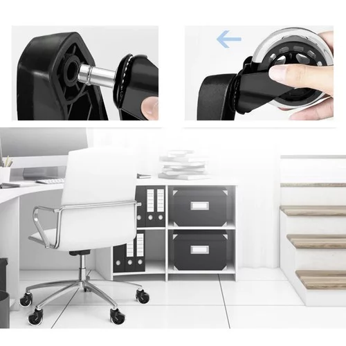 A pótkerek készlete ideális irodai, játék, forgó és gyermek székekhez. Kiváló minőségű gumiból készült, védi a padlót a karcolásoktól, és egyben csendes és sima mozgást biztosít a széknek. A telepítés egyszerű a push-and-click rendszernek köszönhetően, így pillanatok alatt új életet adhatsz a székednek.