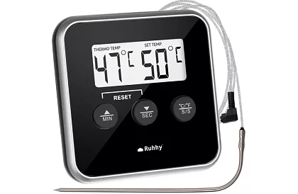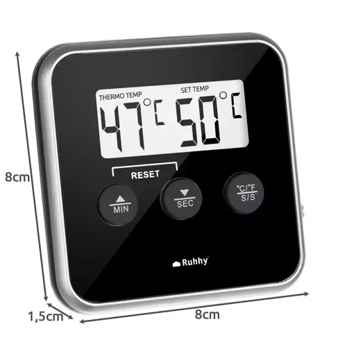 Ez a hőmérő ideális segítőtárs a húsok, folyadékok vagy olajok előkészítéséhez, és lehetővé teszi, hogy könnyedén ellenőrizze a hőmérsékletet akár egy fokos pontossággal is. A nagy és jól olvasható LCD kijelző biztosítja az értékek könnyű olvasását, míg a hátsó mágnes lehetővé teszi a hőmérő fémfelületekhez, például hűtőszekrényhez, sütőhöz vagy grillhez való rögzítését. A hangjelzés funkció figyelmeztet, amint a hőmérséklet eléri a beállított értéket, és a praktikus időzítő megkönnyíti a főzési idő pontos nyomon követését.