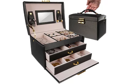 A ékszertartó praktikus és biztonságos módja az ékszerek, órák, érmék és egyéb értékek rendezésének és védelmének. A 20 rekesz, 2 fiók és hengerek segítségével mindent áttekinthetően tárolhat. A kulcsos zár biztosítja a tartalom biztonságát, a klasszikus selyemfényű felület és az elegáns részletek luxus megjelenést kölcsönöznek az ékszertartónak.