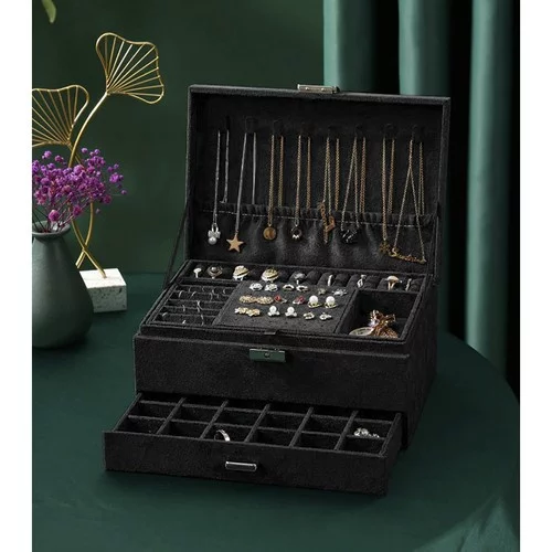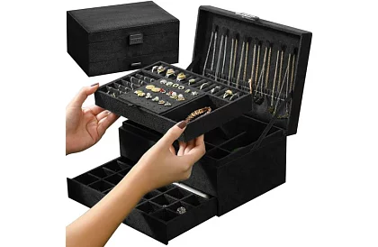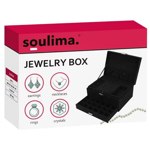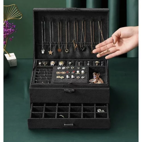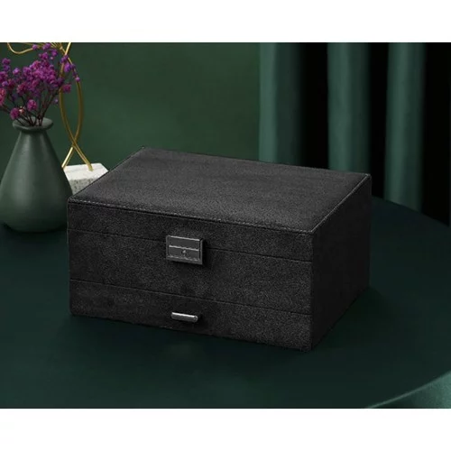 Elegáns és praktikus ékszertartó, amely segít megőrizni a tökéletes rendet ékszergyűjteményében. A gondosan megtervezett belső elrendezésnek köszönhetően könnyedén tárolhatja a gyűrűket, nyakláncokat, fülbevalókat, karkötőket és órákat úgy, hogy védve, áttekinthetően elrendezve és mindig kéznél legyenek. Az időtlen fekete szín ezüst részletekkel luxus hatást kelt, és bármilyen belső térbe illik.