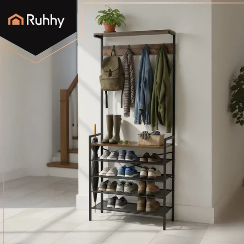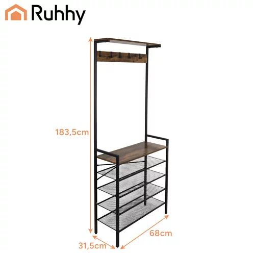 A szabadon álló fal ötvözi a stílust és a funkcionalitást, és segít a kabátok, cipők és kiegészítők mindig kéznél tartásában. Robusztus fémkeret biztosítja a stabilitást, négy tágas polc és öt praktikus akasztó rendben és átláthatóan tartja a dolgokat, míg a felső polc helyet biztosít a kalapoknak és sálaknak. Ideális előszobákba, öltözőkbe és irodákba.