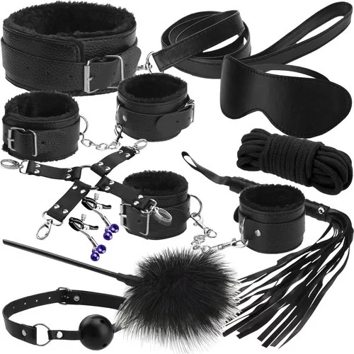 • 10 elem a készletben – bilincsek, lábbilincsek, szemmaszk, nyakörv pórázzal, ostor, gag, bilincsek összekötő hevederei, toll, mellbimbó csipeszek, erős kötél