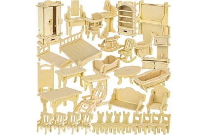 A minőségi fából készült bútor hosszú távú használatot és ellenállást garantál intenzív játék közben. Összeszerelhető elemek élek csiszolásával biztosítják a biztonságos összeszerelést és a színek saját igények szerinti módosításának lehetőségét. A bútor megfelelő méretű, hogy tökéletesen illeszkedjen a különböző baba házakba és lehetővé tegye a változatos belső terek kialakítását. A készlet teljes berendezést tartalmaz minden helyiséghez, és fejleszti a kreativitást és a képzeletet.
