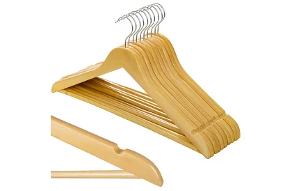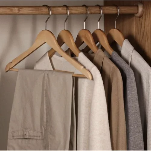 Elegáns fa akasztók rendet, átláthatóságot és hosszú távú védelmet nyújtanak a ruházatnak. Tömbfa finom áttetsző lakkal biztosítja a magas ellenállást, a természetes megjelenést és a védelmet a nedvességtől és a karcolásoktól. Az ergonomikus forma segít megőrizni a ruhák természetes formáját, csökkenti a gyűrődés kockázatát, és egységes, tiszta stílust ad a ruhásszekrénynek.