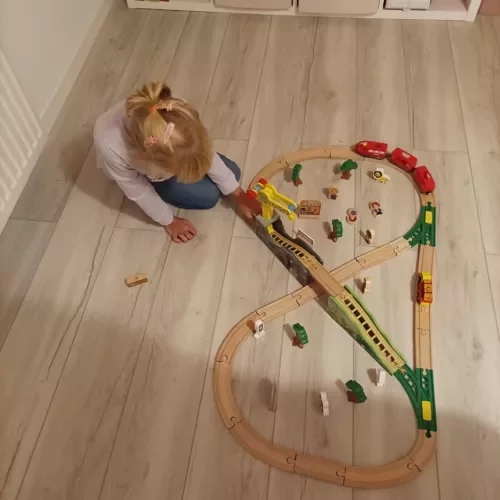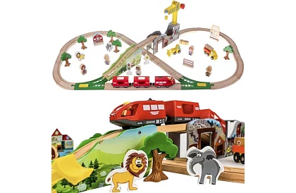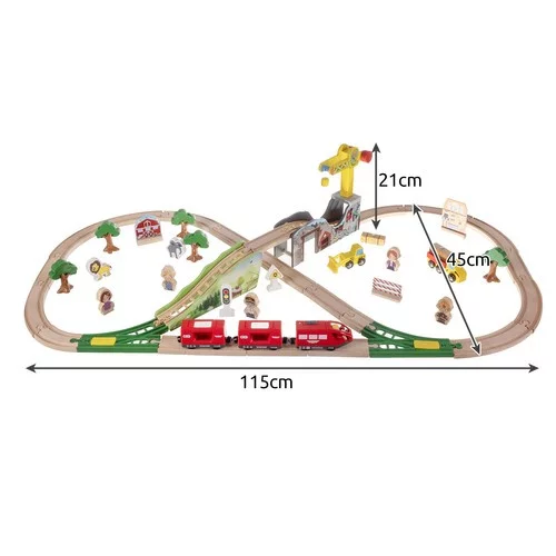 A nagy fa vonatpálya készlet 57 gondosan megmunkált és részletesen kidolgozott elemet kínál, amellyel a gyermek saját pályát és a környező tájat építhet. A vonatok mágneses kapcsolata biztonságos és szilárd összekapcsolást biztosít, míg a kiegészítők, mint a fák, épületek, figurák és daruk, serkentik a kreativitást és órákon át tartó szórakozást nyújtanak.