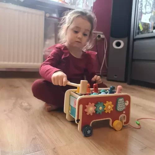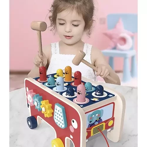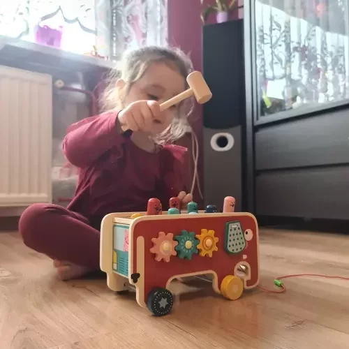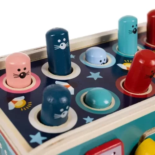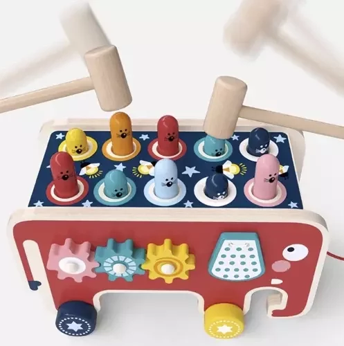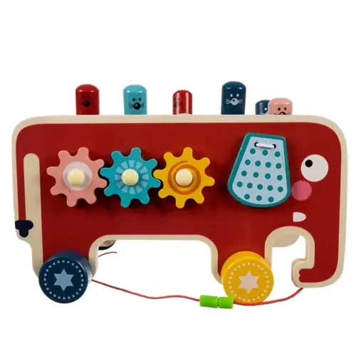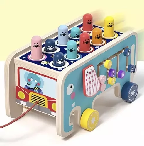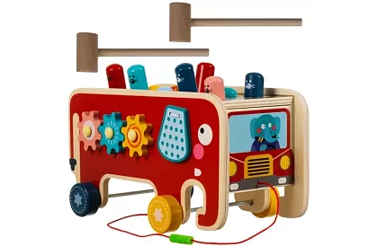 Színes fa játék elefánt formájában, amely szórakozást és fejlődést kínál egyaránt. A gyermek gyakorolja a logikai gondolkodást, a kézmozgást, a szem-kéz koordinációt, és tanulja a színeket és a számolást. A játék támogatja a kreativitást, a szociális készségeket és az önálló, valamint csoportos játékot, miközben örömet hoz egy egész generációnak.