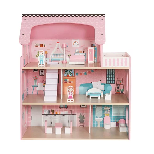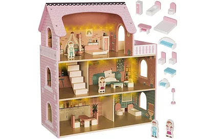 A nagy fából készült babaház 3 szinttel végtelen kreatív játékteret kínál. A simára csiszolt fa masszív szerkezete biztosítja a biztonságot és a hosszú élettartamot. A gazdag bútor készlet azonnali játékra kész, kiegészítők vásárlása nélkül. Az integrált LED világítás valósághű légkört teremt a babaházban, és a játékot varázslatos élménnyé alakítja még este is. Ideális ajándék, amely ötvözi a szórakozást, a fantáziát és a gyermekek kreativitásának fejlődését.
