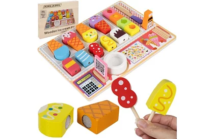 A játékkal készült fagyizó szórakoztató formáját hozza a tanulásnak játék közben, amely fejleszti a gyerekek fantáziáját, motorikus készségeit és szociális képességeit. A gyerekek játszhatnak eladókat és vásárlókat, fagyikat készíthetnek színek és formák szerint, és létrehozhatják saját kombinációikat. Természetes fa, vidám színek és nagy kiegészítő készlet biztosítja a hosszú órák értelmes szórakozását otthon és az óvodában.