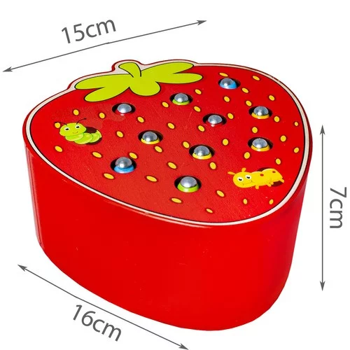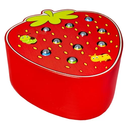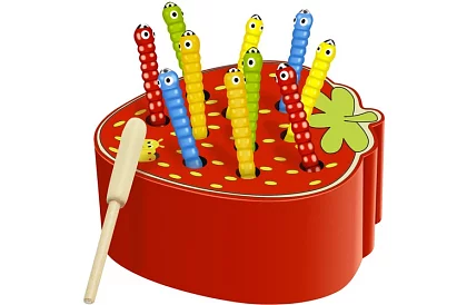 Fejleszd a motorikát, a kéz-szem koordinációt és figyelmet a kisgyermek játékos formában. A játék lényege, hogy a gyümölcs lyukaiban elrejtett férgeket mágneses rúddal elkapjuk, majd visszahelyezzük őket. Erősíti a koncentrációt, a manuális ügyességet és támogatja a kreativitást. A élénk színek és a valósághű eper design miatt a játék vizuálisan vonzó a gyerekek számára, és serkenti a fantáziát.
