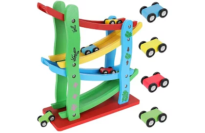 Ezzel a fából készült pályával a gyerekek órákon át szórakozhatnak autók indításával. A színes autók fejlesztik a finommotorikát, a kézügyességet és a színek felismerésének képességét. A játék biztonságos, tartós és ökologikus alternatíva a műanyag játékokkal szemben, amely támogatja a játékos tanulást és a logikus gondolkodást.