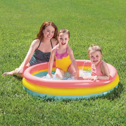 A biztonságos gyerekmedence puha felfújható aljjal kényelmet és védelmet nyújt a kisgyermekek számára a vízben való játék során a kertben, teraszon vagy erkélyen. Könnyű összeszerelés és tárolás biztosítja a gyors felkészülést a használatra és a szülők nyugalmát, míg a puha falak és felfújható alj védik a gyermek lábait és növelik a kényelmet. Szivárványos színek csábítják a gyerekeket a hosszabb és szórakoztatóbb játékra.