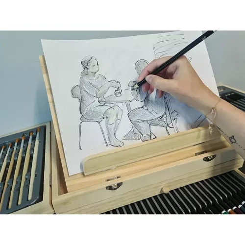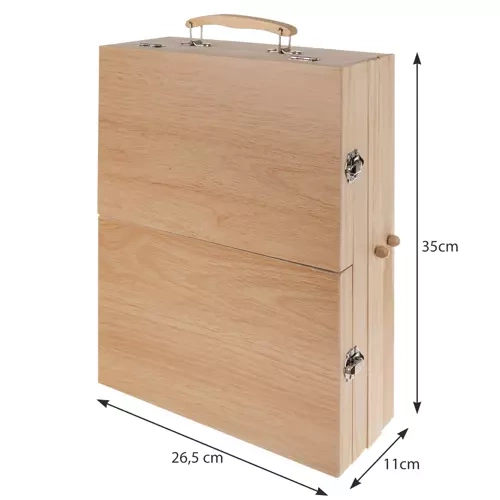 Óriási választék 83 elemből lehetővé teszi, hogy kreativitását és fantáziáját minden művész kibővítse. Festő készlet tartalmaz mindent, amire szüksége van sokoldalú és eredeti műalkotások létrehozásához – ecsetektől, ceruzáktól és színes ceruzáktól kezdve a festékekig és állványokig. A praktikus fából készült állványos bőrönd gyors és kényelmes hozzáférést biztosít az egyes alkatrészekhez, és minden elem áttekinthetően van elrendezve, így könnyen fenntartható a rend és a biztonság használat közben.