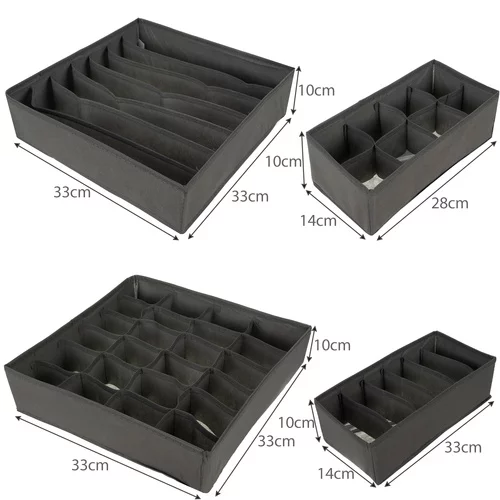 Praktikus négy tároló készlet, amely rendet teremt a fiókjában és szekrényében. Minden tároló más-más típusú fehérneműhöz alkalmas, és segít gyorsan megtalálni, amire szüksége van. A hajtogatható konstrukciónak és a lélegző anyagnak köszönhetően a tárolók kényelmesek, tartósak és könnyen karbantarthatók.
