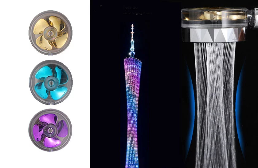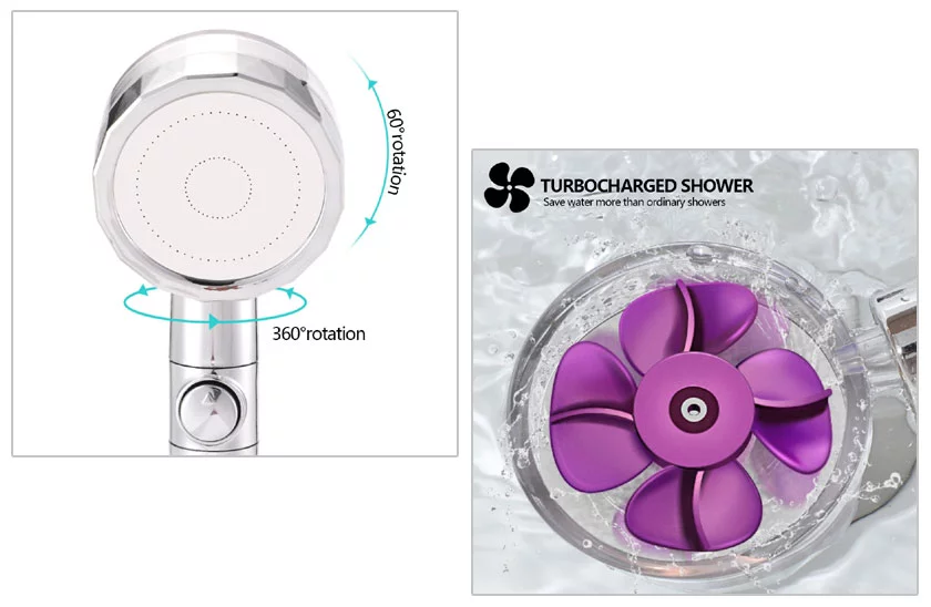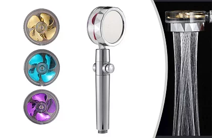 Eredeti TurboShower zuhanyfej kis ventilátorral. A fej nagyobb vízáramlást és jobb nyomást biztosít, mint a hagyományos zuhanyfejek. A zuhanyfej lenyűgözi a nem mindennapi vízáramlatával is, amely spirális folyamra hasonlít. Egyik kezével a víz áramlást a "STOP" gomb megnyomásával megállíthatja, a másikkal pedig kényelmesen habzhatja a haját. A sok speciálisan kialakított fúvókának köszönhetően évente akár 30% vizet takaríthat meg. Ez persze a vízszámlán is érezhetően tükröződhet.