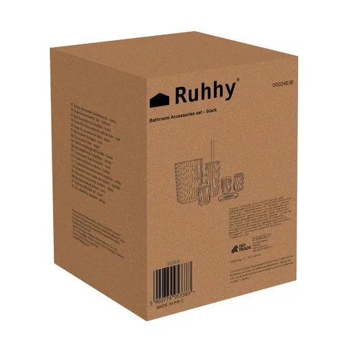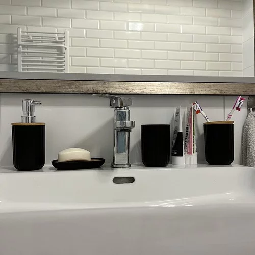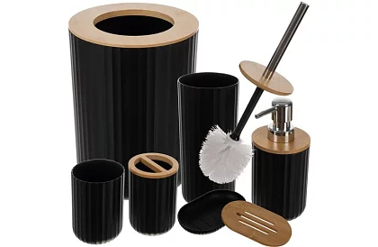 Magas minőségű 6 darabos fürdőszobai kiegészítő készlet ötvözi a funkcionalitást, eleganciát és modern dizájnt. A fekete szín bordázott felülettel és bambusz részletekkel stílust ad a fürdőszobának, miközben kényelmet és higiéniát biztosít a használat során. Minden elem praktikus, tartós és könnyen karbantartható, így a készlet ideális választás a mindennapi használatra és ajándéknak is.