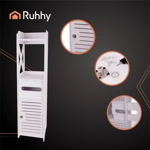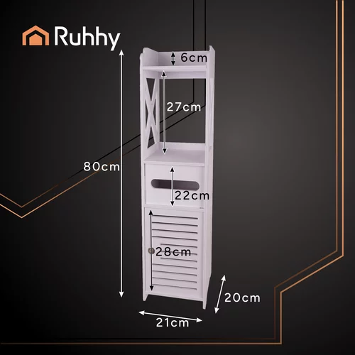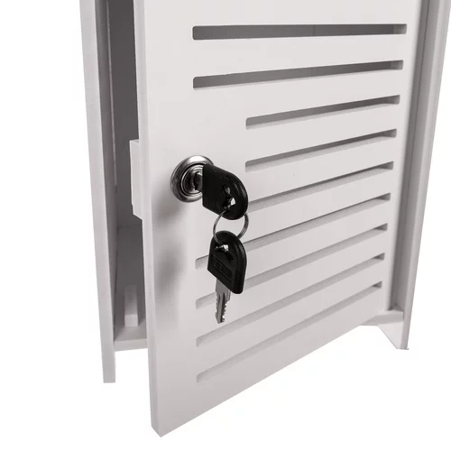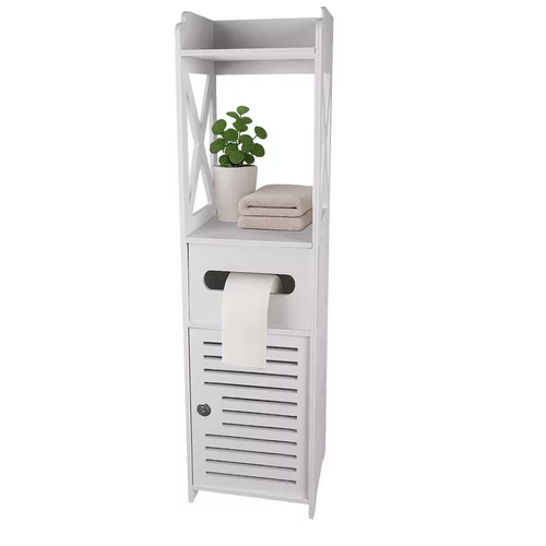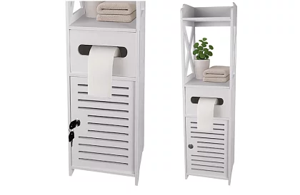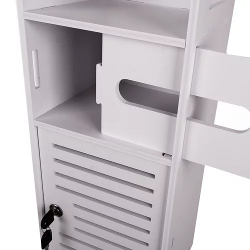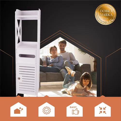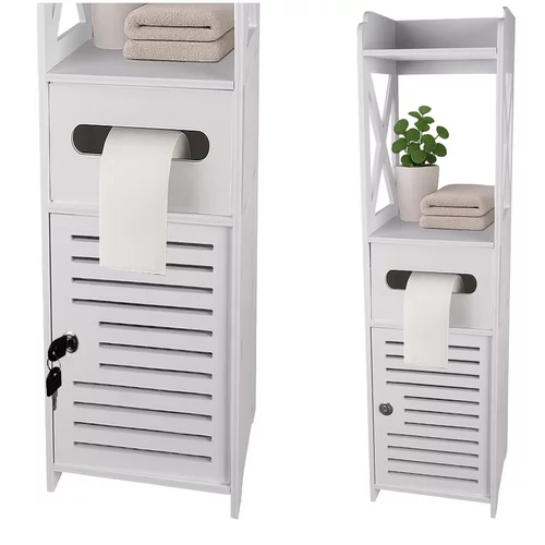A praktikus fürdőszobai oszlop elegáns fehér színben segít rendben tartani a kisebb fürdőszobát is. A kompakt kivitel elegendő tárolóhelyet kínál a kozmetikumok, tisztítószerek és toalettpapír számára, míg a beépített tartó lehetővé teszi a higiénikus és gyors használatot. A perforált ajtók könnyed és modern megjelenést kölcsönöznek a szekrénynek, miközben biztosítják a természetes levegőáramlást. A zárható kivitel védi a tartalmat a gyermekektől és a nem kívánt hozzáféréstől.
