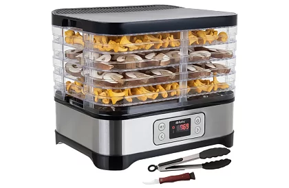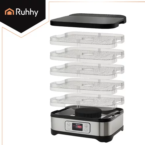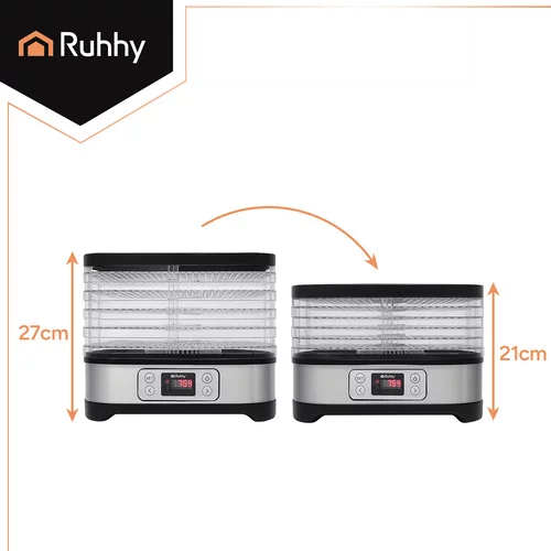 A szárító RUHHY lehetővé teszi, hogy könnyedén készítsen otthoni készleteket az egész évre. Egyenletesen szárítja gombákat, gyümölcsöket, zöldségeket és fűszernövényeket az 5 tálcának köszönhetően, amelyek térfogata 10 liter, a 35–70 °C közötti pontos hőmérséklet-szabályozás és a 24 órás időzítő. Az áttekinthető LCD kijelző és az intuitív vezérlőpanel biztosítja a kényelmes, tiszta és energiatakarékos szárítást, míg a praktikus tartozékok készlete lehetővé teszi a azonnali használatot és az alapanyagok univerzális feldolgozását.
