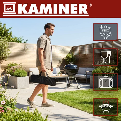 A teljes grill szerszámkészlet mindig kéznél van egy masszív táskában, amely lehetővé teszi az ételek kényelmes és gyors elkészítését. A készlet biztonságos grillezést biztosít a hosszú fogantyúknak köszönhetően, amelyek védik a kezeket a hőtől, és az egyes eszközök különálló fogantyúkkal rendelkeznek a könnyű és áttekinthető hozzáférés érdekében. Az ellenálló rozsdamentes acél hosszú élettartamot és egyszerű tisztítást garantál, míg a selymes fogantyúk elegáns megjelenést és kényelmes fogást biztosítanak.