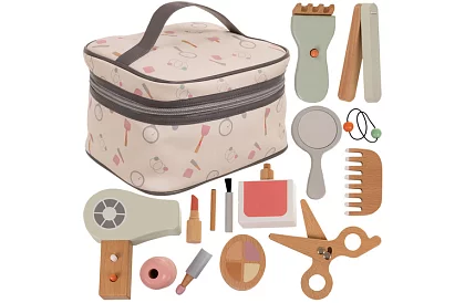 A kreativitás, játék és tanulás kapcsolata egy biztonságos fa készletben a kis stylistok és sminkesek számára fejleszti a fantáziát, a finommotorikát és az önbizalmat. Teljes felszerelés – hajszárító, fésű, körömlakk, rúzs, szemhéjpúder paletta és egyéb – lehetővé teszi a szépség világából származó valósághű jelenetek lejátszását, miközben támogatja a koordináció és a szociális készségek fejlődését. A praktikus kozmetikai táska biztosítja az egyszerű tárolást és a szállíthatóságot utazásokra vagy óvodába.