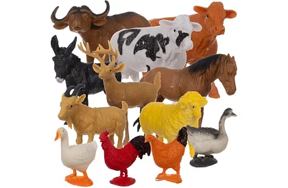 • Tartalmaz 12 háziállatot – juh, ló, 2 különböző fajtájú tehén, kecske, szamár, tyúk, kacsa, bivaly, lúd, kakas, szarvas