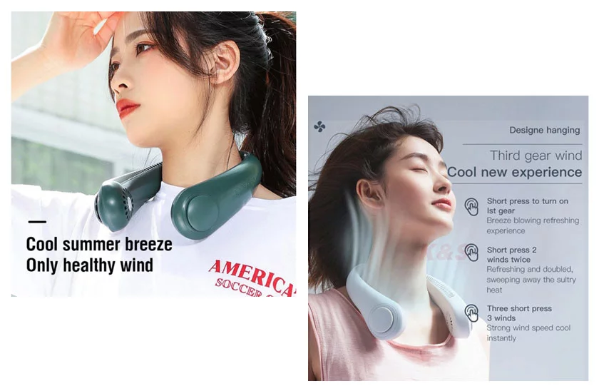 Ventilátor, mely egyszerűen a nyakon hordozható, Felfrissíti a forró nyári napon, sportolás idején, intenzív edzés után, esetleg a kerti munka során. Három fokozatú hűtési intenzitást kínál, a ventilátor a beépített turbinán keresztül szívja be a levegőt, hűti és miniatűr réseken keresztül engedi ki.A speciális kialakítás gondoskodik arról, hogy a beépített ventilátor ne húzza be a haját, valamint az egész készülék kényelmes viseletet biztosít. Kényelmes vezérlés gombbal, melynek többszöri megnyomásával kiválaszthatja a hűtési fokozatot. Feltöltés USB-kábel által.