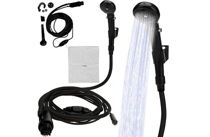 A hordozható utazási zuhany praktikus eszköz a turisták, utazók és kempingezők számára, akik kényelmesen szeretnék megmosni a testüket és az edényeiket olyan helyeken, ahol nincs hagyományos zuhany. A 3,5 l/perc magas áramlású szivattyúnak köszönhetően a víz áramlását pontosan a saját igényei szerint állíthatja be – szinte mint otthon. A zuhany könnyen hordozható, gyorsan telepíthető, és a szűrőnek köszönhetően a víz tiszta marad. Tartozékai között szerepel egy felfüggeszthető tartó, dupla horog és táska, amely tartályként vagy védőburkolatként szolgál.