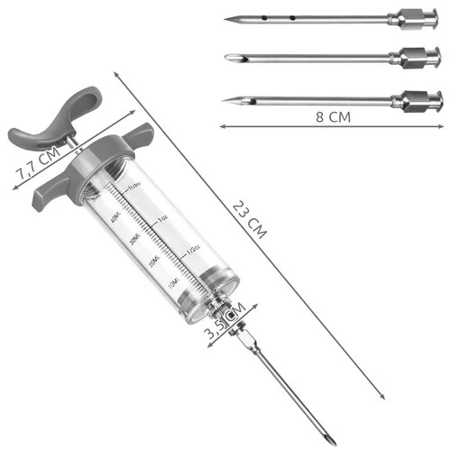 A praktikus húsinjektor ideális szaftos és jól fűszerezett hústermékek elkészítéséhez. Lehetővé teszi a hús sóoldattal vagy fűszerekkel való injektálását, ezzel felgyorsítva a pácolást és biztosítva az egyenletes ízt. Ennek köszönhetően „belülről” pácolhatja a húst az intenzívebb íz és jobb eredmények érdekében sütés vagy grillezés során.