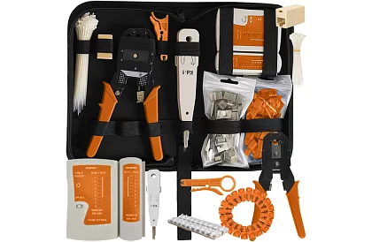 • Teljes hálózati szerszámkészlet – krimpelő fogók, szigetelőfogók, lyukasztó, RJ45 csatlakozók és védőburkolatok