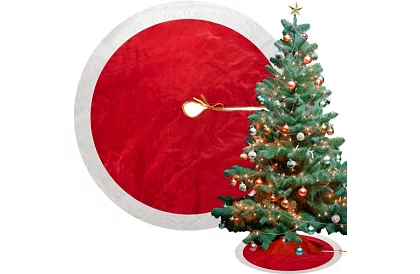 Az alátét arany szegéllyel van ellátva, amellyel a szőnyeget két helyen rögzítheti a fa alatt, így szilárdan a helyén marad, és a dekorációk tökéletesen rendezettek.