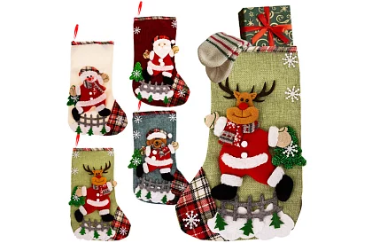 Karácsonyi varázst hoz minden belső térbe, és dekoratív ajándékcsomagolásként szolgál. Négy térbeli zokni Mikulás, rénszarvas, hóember és mackó mintákkal lehetővé teszi egy látványos és egységes dekoráció létrehozását, amely azonnal felhívja a figyelmet és örömet szerez a vendégeknek. A zoknik praktikus méretet kombinálnak luxus karácsonyi dizájnnal, így alkalmasak apró ajándékokhoz, édességekhez vagy dekorációkhoz.