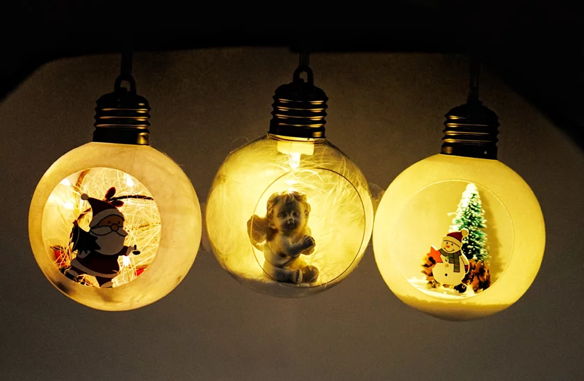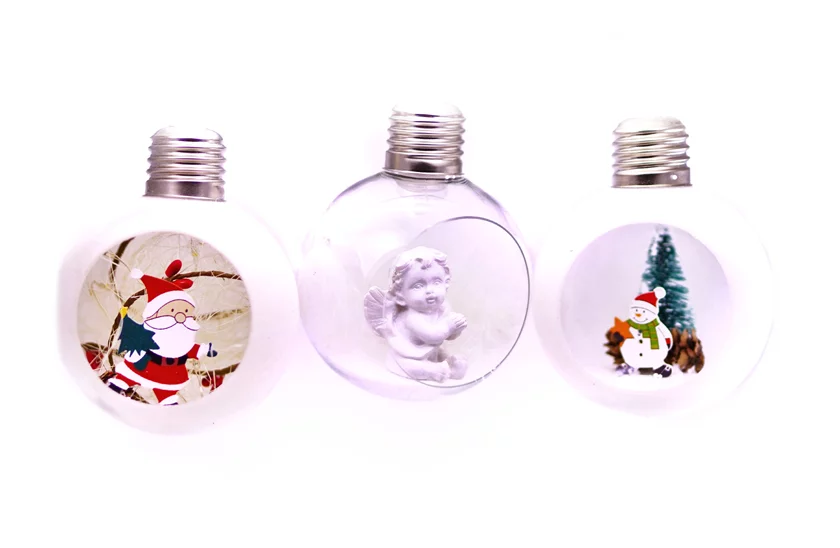 Karácsonyi díszlombikok, karácsonyi dísz, népszerű dekoráció elrendezés. Minden lombik saját LED világítással rendelkezik, amely kiegészíti a lombikon belüli dekoráció részleteit. A készlet 3 lombikot tartalmaz, az egyik világos egy kis angyallal, és két fehér velúr, karácsonyi témával a lombik belsőjében.