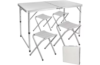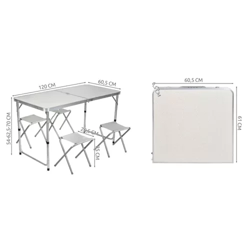 A hajtható kemping szett praktikus és kényelmes megoldást kínál családi kirándulásokhoz, piknikekhez vagy gyerekbulikhoz. A háromszintes magasságállítású asztal felnőtteknek és gyerekeknek egyaránt megfelelő, a székek önállóan is használhatók. A kompakt méretek és bőrönd formátum miatt a szett könnyen szállítható és minimális helyet foglal, amit utazás vagy tárolás során értékelni fog. Az ellenálló anyag és a dupla varrás hosszú élettartamot és megbízhatóságot biztosít az egész szettnek.
