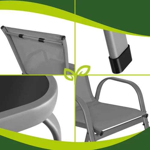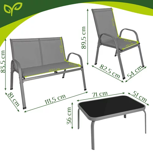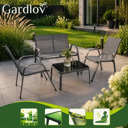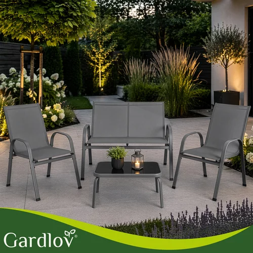 A stílusos kertibútor szett ideális választás a kényelmes pihenéshez a kertben, teraszon vagy erkélyen. A négyfős szett tartalmaz kanapét, két fotelt és asztalt, így elegendő helyet kínál a családdal vagy barátokkal való ücsörgéshez. A modern, szürke dizájn könnyen illeszkedik a kültéri térbe, és egyúttal elegáns megjelenést kölcsönöz a környezetnek. A masszív szerkezet és az időjárásálló anyagok hosszú élettartamot és kényelmes használatot biztosítanak.