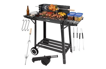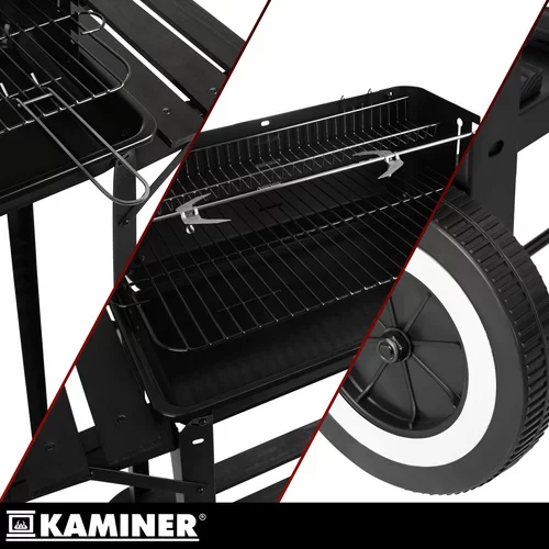 Praktikus és stabil grill forgónyal és melegítővel, amely lehetővé teszi, hogy egyszerre több ételt készítsen, és könnyen fenntartja a hőmérsékletet. Robusztus felépítés és kiegészítő felső rács biztosítja a kényelmes grillezést, míg a grillező kiegészítők rendezett módon maradnak.