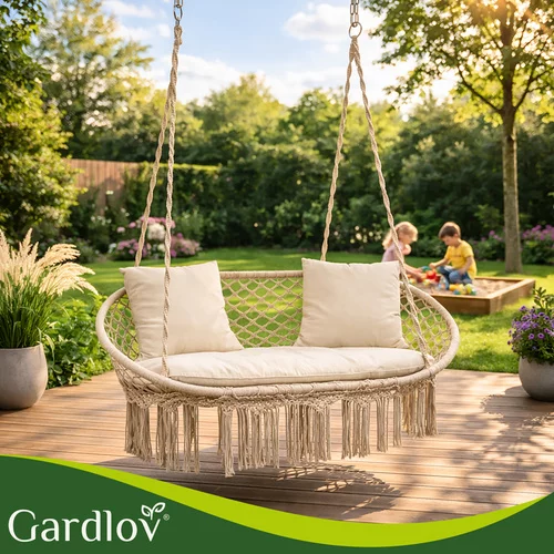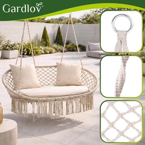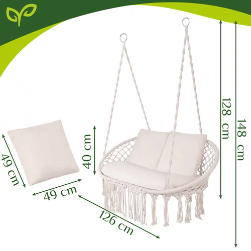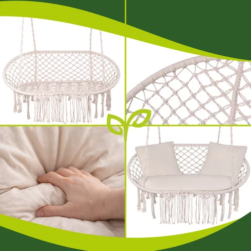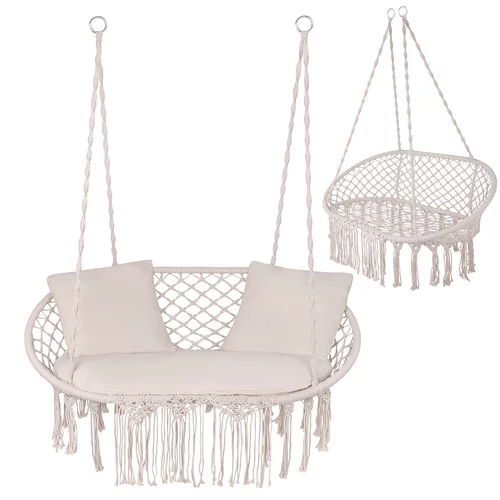 Kényelmes pihenőhely két fő részére átalakítja a kertet, teraszt vagy erkélyt egy pihenésre és kényelemre szolgáló hellyé. Tágas kétüléses és puha párnák lehetővé teszik a kényelmes ülést és a könnyű fekvést, míg a masszív fémkeret és a tartós fém fogantyús kötelek biztosítják a stabilitást és a biztonságot. Stílusos boho dizájn elegáns dekoratív elemet hoz, amely kiegészíti minden kültéri teret, és a változatos felfüggesztési lehetőség lehetővé teszi a hinta saját igényekhez való igazítását.