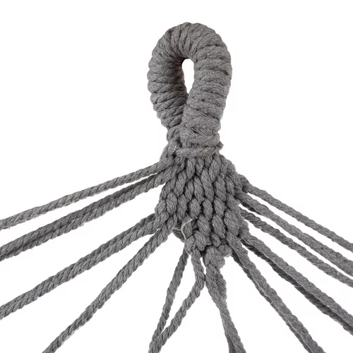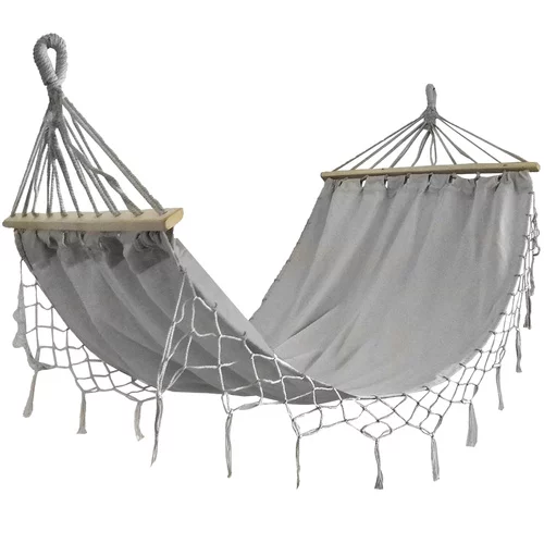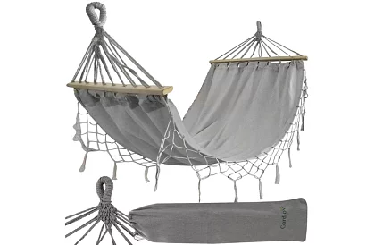 A stabil hinta ellenálló hintaágy kényelmes pihenőhelyet kínál egy vagy két személy számára. Masszív fa rudak és erős kötelek biztosítják a biztonságos felfüggesztést, míg a lélegző pamut és poliészter anyag kényelmes és tartós fekvést biztosít a kertben, teraszon vagy erkélyen.