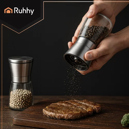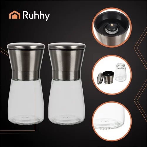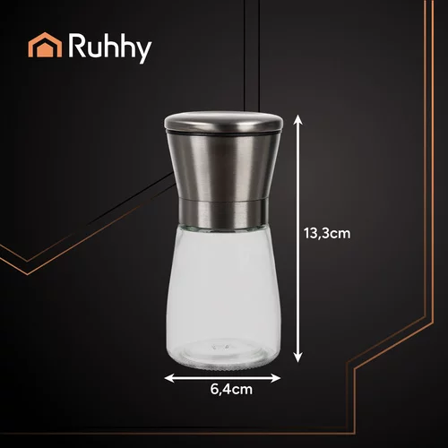 Elegáns és praktikus RUHHY üveg fűszermalom készlet lehetőséget kínál a friss fűszerek őrlésére közvetlenül főzés vagy tálalás közben. A átlátszó üveg lehetővé teszi a fűszerek mennyiségének ellenőrzését, a fém fedél modern megjelenést kölcsönöz, a kerámia mechanizmus pedig pontos kézi őrlést biztosít, hogy minden étel teljes ízét és aromáját élvezhesse. A készlet ideális mindennapi használatra és elegáns terítéshez is.