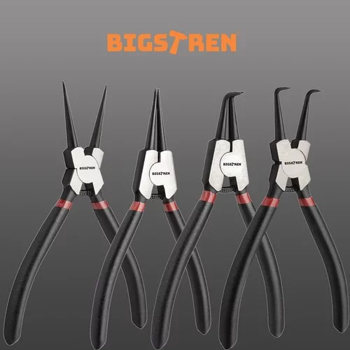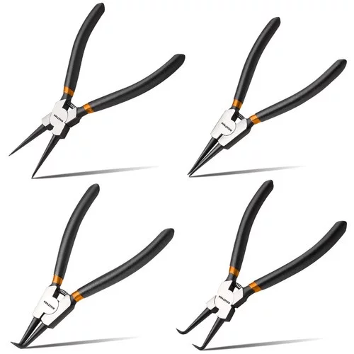 A szeggyűrűs fogók készlete ideális eszköz a pontos és biztonságos munkához a rögzítőgyűrűkkel. A 4 különböző típusú fogónak – 2 egyenes és 2 hajlított – köszönhetően mind a belső, mind a külső gyűrűket kezelheti. A csúszásmentes markolat biztosítja a szilárd fogást, a hosszú markolat pedig kényelmet és pontos irányítást nyújt. A kiváló minőségű szerszámacél tartósságot és hosszú élettartamot biztosít, míg a beépített rugó lehetővé teszi a gyűrűk könnyű szétnyitását vagy összenyomását.