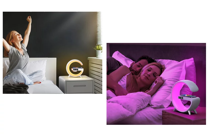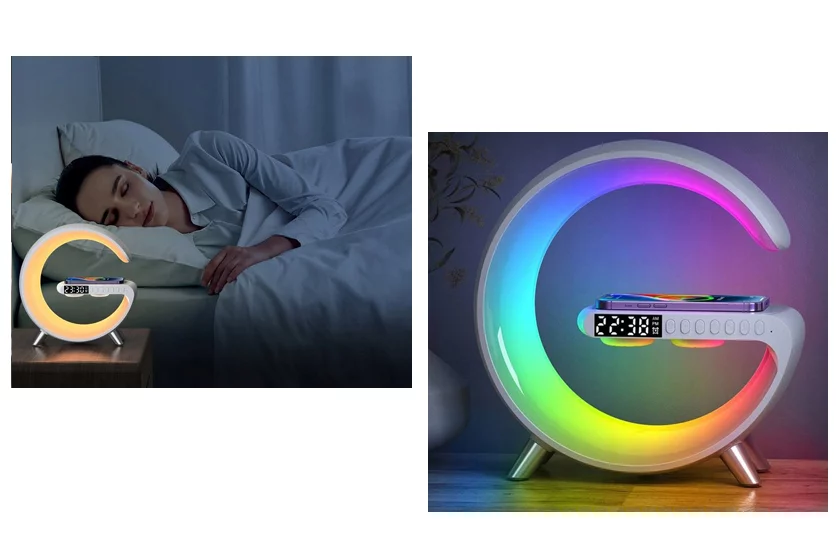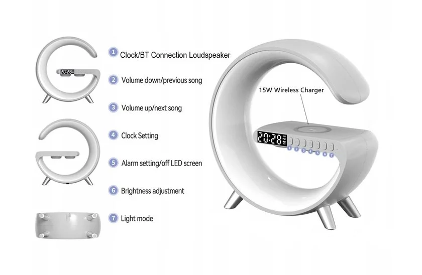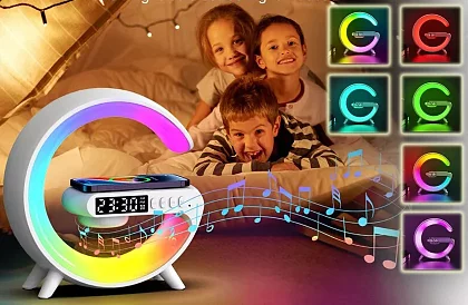 Stílusos Bluetooth hangszóró szivárványos háttérvilágítással, idő kijelzővel, USB-C bemenettel és vezeték nélküli töltéssel. Ez a LED-es asztali lámpa minden színben játszik. A design multifunkcionális lámpa mindenkinek tetszeni fog, aki szereti a zenét. De ugyanakkor megvilágíthatja a munkalapját, és akár a telefonját is töltheti. Modern dizájnjának és funkcióinak köszönhetően nem csak az iskolásoknak és a diákoknak fog örömet okozni, hanem otthon díszítőelemeként is alkalmas.