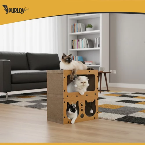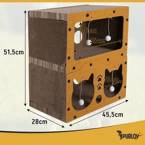Stílusos és praktikus hely a játékhoz, pihenéshez és a körmök ápolásához egyben. A masszív HDF kétszintes szerkezete stabil menedéket kínál a mindennapi pihenéshez és aktivitáshoz. A természetes kaparófelület segít megvédeni a bútorokat, miközben támogatja a macskák természetes viselkedését. A modern dizájn illeszkedik a belső térbe, és kompromisszumok nélkül teremt kedvenc sarkot a háziállat számára.