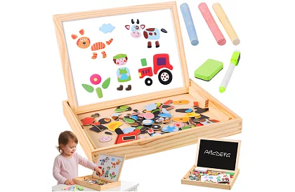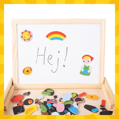 Kétoldalas tanuló tábla támogatja a kreatív játékot és a tanulást játék közben 3 éves kortól. A gyerekek rajzolhatnak, mágneseket rendezhetnek és saját képeket készíthetnek, ami fejleszti a finommotorikát, a logikus gondolkodást és a képzeletet. A fa szerkezet és 108 színes darab biztosítja a tartósságot és a sok lehetőséget a kreatív alkotáshoz.