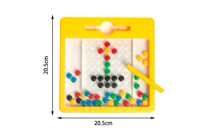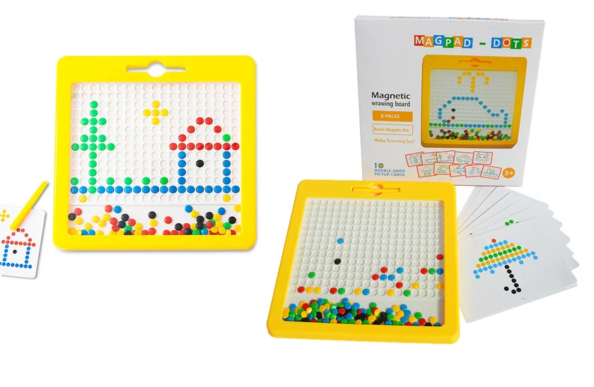 A mágneses tábla egy varázstábla, amely teljes szabadságot ad a gyerekeknek a színes formák és minták alkotásában. Fejleszti a gyermekek finom motoros képességét, támogatja a szem-kéz koordinációt, felébreszti a fantáziájukat és a saját alkotás iránti vágyukat. Az asztal belsőjében színesfém lencsék találhatók. A gyerekeknek szánt mágneses rajztábla kényelmesen hordozható, bármilyen utazótáskában elfér. Tökéletes játék hosszú utakra.