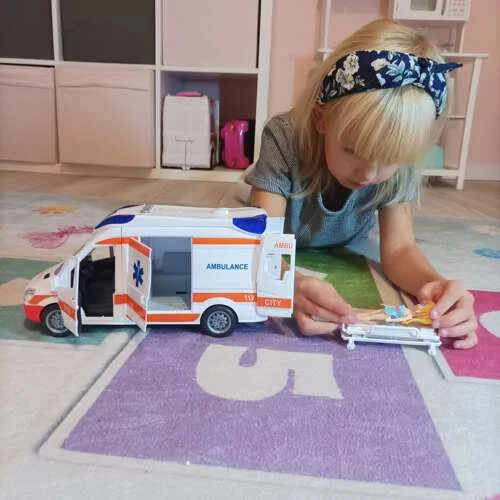 Hozza a gyerekeknek egy valósághű mentési élményt ezzel a mentőautóval, amely kombinálja a funkcionális hang- és fényjelzést, nyitható ajtókat és összecsukható hordágyakat. A játék támogatja a képzelet és kreativitás fejlődését, és lehetővé teszi a gyerekek számára, hogy játékosan megismerjék a mentők munkáját, miközben saját mentési helyzeteket alkothatnak.