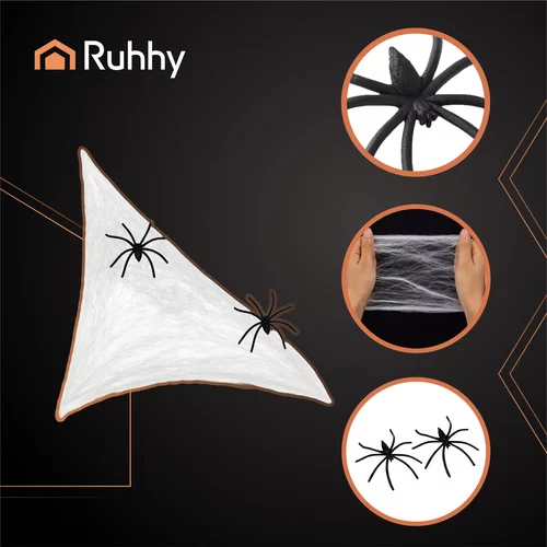 Nagy pókháló két pók nagyszerű dekoráció Halloweenra, tematikus bulikra, színpadra vagy fedett kerthelyiségekbe. Rugalmas és könnyű anyag lehetővé teszi, hogy lenyűgöző és valósághű pókhálót készítsünk, amelyet ajtók, korlátok, falak, lámpák vagy asztalok fölé akaszthatunk. Ideális ijesztő hangulathoz, meglepetésekhez és szórakozáshoz.