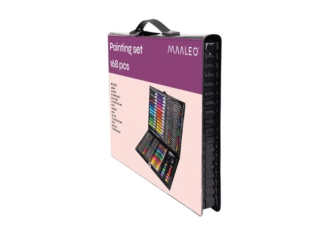168 elem – hatalmas választék 24 színes ceruzából, 24 filcből, 48 olajpasztellből, 48 gyertya pasztellből, 12 akvarell festékből, ecsetből, festőpalettából, hegyezőből, ceruzából, radírból, ragasztóból, korrektorból és 5 A4-es papírlapból lehetővé teszi a legkreatívabb, eredeti és igényes művek létrehozását.