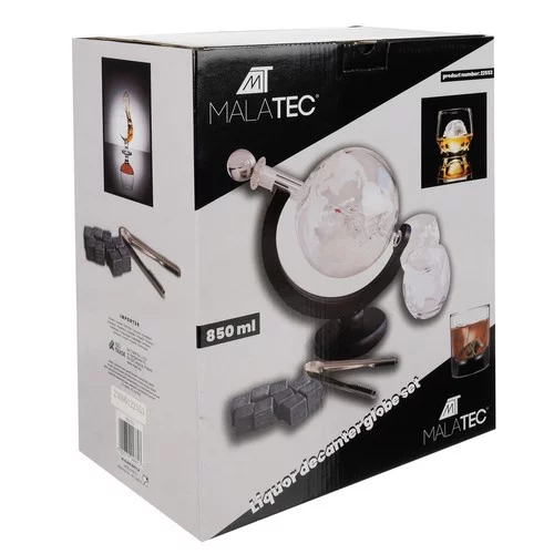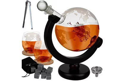 Luxus whisky és utazás kedvelőknek készült szett, amely ötvözi a stílust és a funkcionalitást. A földgömb alakú karafa fából készült állvánnyal, poharakkal, parafadugókkal és hűtőkövekkel stílusos kóstolási élményt nyújt. A karafában lévő hajó egyedi hatást kelt az ital töltésekor.